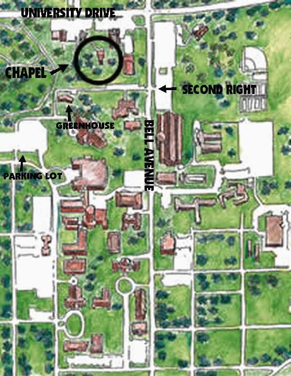 Take the Second RIGHT and follow it down. The chapel will be on your right.